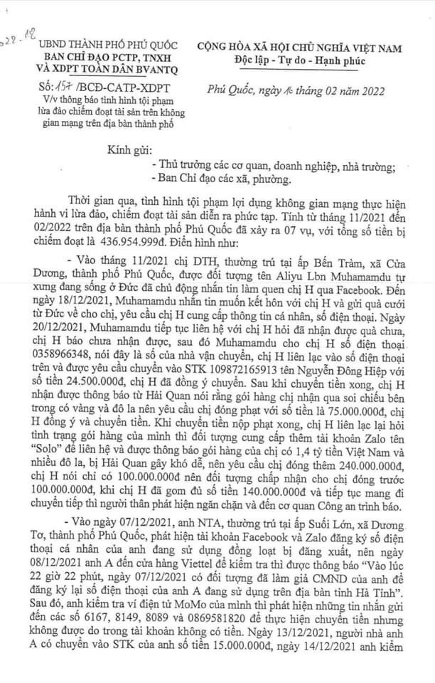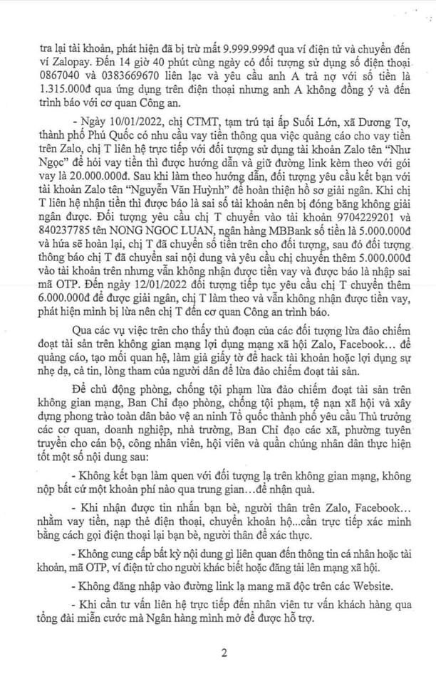 aA Quốc phòng - An Ninh Cảnh báo phương thức lừa đảo, chiếm đoạt tài sản trên không gian mạng 21/02/2022, 08:33 Quay về Chia sẻ Z Copy link thành công Tin khác CÔNG AN XÃ GIANG THÀNH RA QUÂN THỰC HIỆN CAO ĐIỂM TẤN CÔNG, TRÁN ÁP TỘI PHẠM BẢO ĐẢM TÌNH HÌNH AN NINH, TRẬT TỰ Quốc phòng - An Ninh 21/08/2025 Giang Thành: Tổ chức thành công Hội trại tòng quân và Lễ giao nhận quân năm 2025 Quốc phòng - An Ninh 13/02/2025 HUYỆN GIANG THÀNH TỔNG KẾT CÔNG TÁC THI ĐUA, KHEN THƯỞNG VÀ PHONG TRÀO THI ĐUA QUYẾT THẮNG NĂM 2024, CỤM THI ĐUA SỐ 1 – BỘ CHQS TỈNH KIÊN GIANG Quốc phòng - An Ninh 15/11/2024 Thông báo Tình hình tội phạm lừa đảo trên không gian mạng Quốc phòng - An Ninh 17/07/2024 Bắt khẩn cấp đôi vợ chồng trẻ trộm cắp xe Quốc phòng - An Ninh 16/07/2024 Giang Thành Lễ ra mắt lực lượng tham gia bảo vệ an ninh, trật tự ở cơ sở Quốc phòng - An Ninh 02/07/2024 Huyện Giang Thành Diễn tập chiến đấu xã Tân Khánh Hòa trong khu vực phòng thủ năm 2024 Quốc phòng - An Ninh 02/07/2024 Giang Thành bế giảng lớp bồi dưỡng kiến thức Quốc phòng và An ninh đối tượng 4 năm 2024 Quốc phòng - An Ninh 29/06/2024 GIANG THÀNH SƠ KẾT 5 NĂM THỰC HIỆN NGHỊ ĐỊNH 21 CỦA CHÍNH PHỦ VỀ KHU VỰC PHÒNG THỦ Quốc phòng - An Ninh 01/06/2024 Khen thưởng 37 tập thể, cá nhân có thành tích xuất sắc trong công tác xây dựng lực lượng dự bị động viên năm 2023 Quốc phòng - An Ninh 25/05/2024 /canh-bao-phuong-thuc-lua-dao-chiem-doat-tai-san-tren-khong-gian-mang