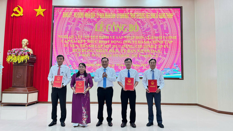 Sáng ngày 30-6-2025, Huyện ủy, HĐND, UBND, UBMTTQ Việt Nam huyện Giang Thành long trọng tổ chức Lễ công bố các nghị quyết, quyết định của Trung ương về sáp nhập đơn vị hành chính cấp xã, kết thúc hoạt động đơn vị hành chính cấp huyện, thành lập tổ chức đảng, chỉ định cấp ủy, Hội đồng nhân dân, ủy ban nhân dân, ủy ban mặt trận tổ quốc Việt Nam xã Giang Thành, tỉnh An Giang năm 2025. Dự Lễ công bố có đồng chí Phạm Văn Đằng- Phó chủ tịch thường trực LĐLĐ tỉnh; đ/c Tạ Minh Danh – Nguyên Bí thư Huyện ủy; đ/c Ong Văn Ngay- Nguyên Bí thư Huyện ủy, Nguyên Phó trưởng ban tổ chức Tỉnh ủy; đ/c Lâm Dũ Trung – Nguyên Phó Bí thư Thường trực Huyện ủy; đ/c Nguyễn Thị Liễu – Phó Chủ tịch HĐND huyện.
