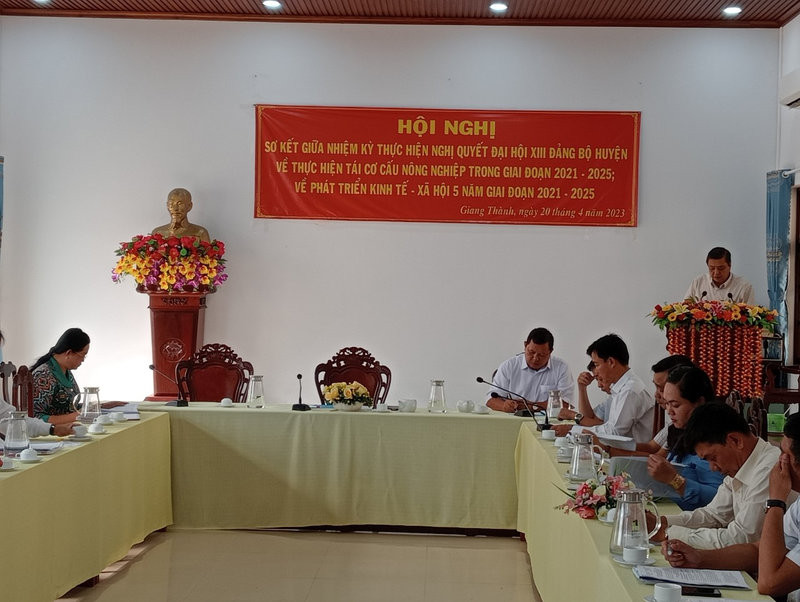 Thực hiện kế hoạch phát triển kinh tế xã hội giai đoạn 2021-2025 trong điều kiện chịu nhiều ảnh hưởng bởi dịch bệnh Covid-19, nhưng kinh tế của huyện vẫn giữ vững ổn định và có bước tăng trưởng. Cơ sở hạ tầng kỹ thuật từng bước được đầu tư hoàn thiện; hạ tầng khung, công trình trọng điểm cơ bản hình thành, góp phần kết nối các khu vực để phát triển. Sản xuất lúa của huyện sớm đạt và vượt Nghị quyết Đại hội; thành lập được Liên hiệp Hợp tác xã huyện Giang Thành, qua đó tạo điều kiện thuận lợi để áp dụng tiến bộ khoa học công nghệ trong sản xuất và chủ động liên kết sản xuất và tiêu thụ sản phẩm. Trong lĩnh vực đầu tư công, Huyện ủy, UBND huyện tăng cường chỉ đạo, thường xuyên khảo sát, kiểm tra các công trình và chỉ đạo các cơ quan liên quan phối hợp đơn vị thi công đảm bảo theo tiến độ, cũng như chất lượng công trình; chỉ đạo giải ngân đảm bảo theo yêu cầu của Chủ tịch UBND tỉnh. Thu ngân sách trên địa bàn đạt cao so với kế hoạch. Các chương trình mục tiêu quốc gia được triển khai đảm bảo theo kế hoạch. Các chính sách an sinh xã hội, chăm lo gia đình chính sách, người có công được triển khai thực hiện đầy đủ, kịp thời. Công tác giảm nghèo được tập trung lãnh đạo. Công tác phòng, chống dịch bệnh, tiêm ngừa vắc xin Covid-19 tiếp tục được triển khai chặt chẽ, kịp thời. Giáo dục và đào tạo tiếp tục phát triển, chất lượng được nâng lên. Tình hình dân tộc, tôn giáo tiếp tục ổn định. Công tác cải cách hành chính và kiểm soát thủ tục hành chính được tăng cường, chỉ đạo thường xuyên đảm bảo hiệu quả. Quốc phòng, an ninh tiếp tục được củng cố, tăng cường; trật tự an toàn xã hội được đảm bảo.