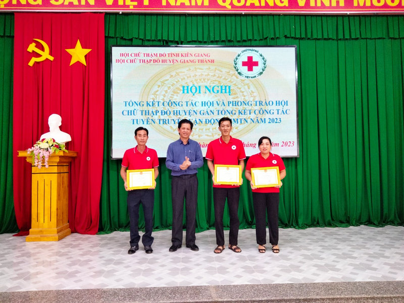 Dịp này, UBND huyện Giang Thành đã tặng giấy khen cho 03 tập thể, 04 cá nhân đã có thành tích xuất sắc trong công tác vận động hiến máu tình nguyện năm 2023. Hội chữ thập đỏ huyện tặng giấy khen cho 03 tập thể, 04 cá nhân hoàn thành xuất sắc nhiệm vụ Hội và phong trào chữ thập đỏ năm 2023./.