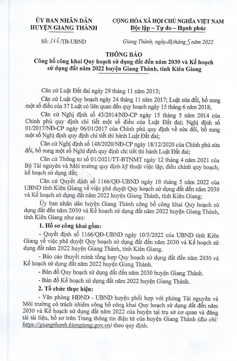 aA Quy hoạch - Phát triển Huyện Giang Thành công bố Quy hoạch sử dụng đất đến năm 2030 và Kế hoạch sử dụng đất năm 2022 13/06/2022, 10:02 Thông tin chi tiết kèm tập tin đính kèmTập tin đính kèm:QHSDD 2030 huyen Giang Thanh - duyet QD 1166.rar Quay về Chia sẻ Z Copy link thành công Tin khác Đề án: Quy hoạch quảng cáo ngoài trời trên địa bàn huyện Giang Thành đến năm 2025, định hướng đến năm 2040 Đề án: Quy hoạch quảng cáo ngoài trời trên địa bàn huyện Giang Thành đến năm 2025, định hướng đến năm 2040 Quy hoạch - Phát triển 03/07/2019 Công bố quy hoạch hạ tầng kỹ thuật viễn thông thụ động tỉnh Kiên Giang đến năm 2020 và định hướng đến năm 2030 Quy hoạch - Phát triển 23/04/2019 Quy hoạch xây dựng cơ sở giết mổ gia súc, gia cầm tập trung huyện Giang Thành Quy hoạch - Phát triển 12/04/2019 Kế hoạch Triển khai thực hiện điều chỉnh quy hoạch tổng thể phát triển kinh tế - xã hội tỉnh Kiên Giang đến 2020 và định hướng đến năm 2030. Quy hoạch - Phát triển 26/09/2018 Giang Thành Thông báo: V/v triển khai thi công dự án Đường tuần tra biên giới tỉnh Kiên Giang (giai đoạn 2014-2016) Quy hoạch - Phát triển 29/06/2018 Kế hoạch sử dụng đất năm 2018 huyện Giang Thành Quy hoạch - Phát triển 10/04/2018 Phê duyệt Quy hoạch phát triển điện lực Kiên Giang giai đoạn 2016-2025, có xét đến 2035 - Quy hoạch chi tiết phát triển lưới điện trung và hạ áp sau các trạm 110kV. Quy hoạch - Phát triển 26/06/2017 UBND HUYỆN GIANG THÀNH HỌP CÔNG BỐ KẾ HOẠCH SỬ DỤNG ĐẤT NĂM 2017 Quy hoạch - Phát triển 23/05/2017 HUYỆN GIANG THÀNH TỔ CHỨC LẤY Ý KIẾN PHƯƠNG ÁN ĐIỀU CHỈNH QUY HOẠCH KHU TRUNG TÂM HÀNH CHÍNH HUYỆN GIANG THÀNH. Quy hoạch - Phát triển 01/04/2017 HIỆU QUẢ TỪ MÔ HÌNH CÁNH ĐỒNG MẪU LỚN VỤ ĐÔNG XUÂN 2016 – 2017 Quy hoạch - Phát triển 02/03/2017 /huyen-giang-thanh-cong-bo-quy-hoach-su-dung-dat-den-nam-2030-va-ke-hoach-su-dung-dat-nam-2022