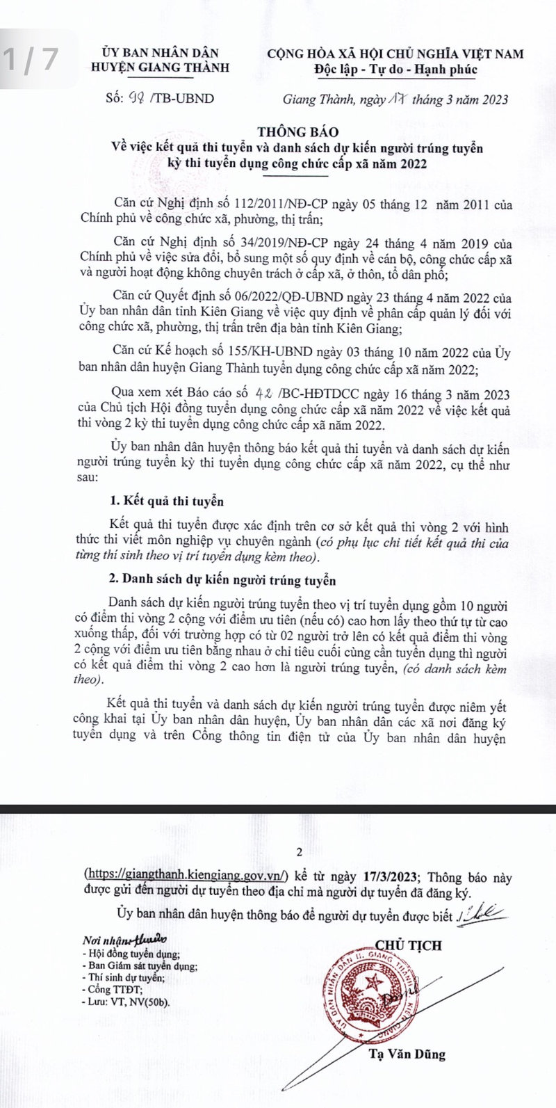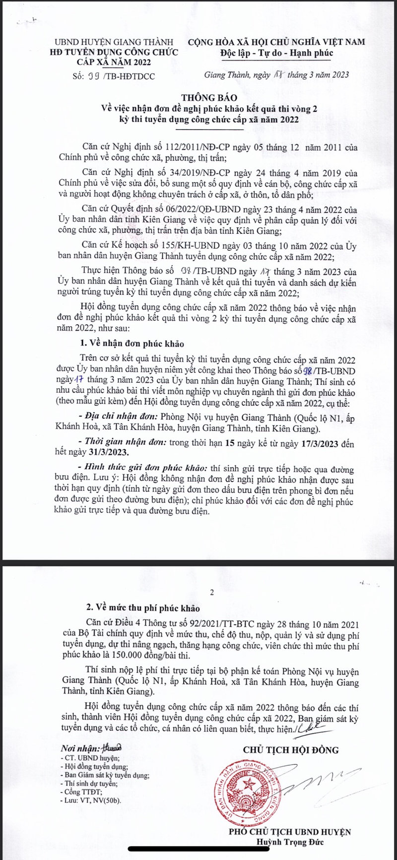 UBND HUYỆN GIANG THÀNH THÔNG BÁO KẾT QUẢ THI TUYỂN VÀ DANH SÁCH DỰ KIẾN NGƯỜI TRÚNG TUYỂN KỲ THI TUYỂN DỤNG CÔNG CHỨC CẤP XÃ NĂM 2022 VÀ THÔNG BÁO NHẬN ĐƠN PHÚC KHẢO VÒNG 2 (CHI TIẾT XEM FILE ĐÍNH KÈM)