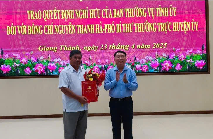 Tại buổi làm việc, đồng chí Nguyễn Văn Hiền - Tỉnh ủy viên, Phó Trưởng ban thường trực Ban Tổ chức Tỉnh ủy Kiên Giang đã công bố và trao Quyết định số 1896/QĐ-TU, ngày 06/02/2025 của Tỉnh ủy Kiên Giang về việc nghỉ hưu đối với đồng chí Nguyễn Thanh Hà, sinh ngày 30/01/1964, Phó Bí thư Thường trực Huyện ủy Giang Thành được nghỉ hưu, hưởng chế độ bảo hiểm xã hội kể từ ngày 01/5/2025.