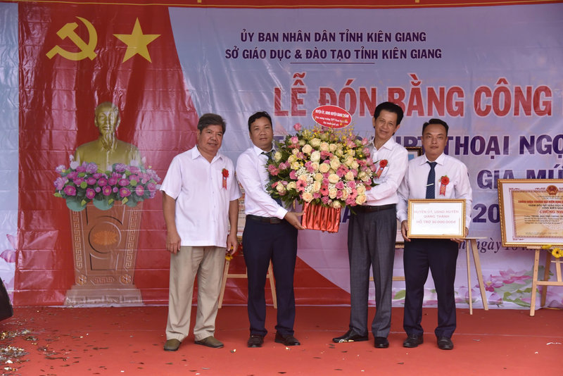 Dịp này, đồng chí Huỳnh Văn Hóa - Phó Giám đốc Sở Giáo dục và Đào tạo; đồng chí Huỳnh Trọng Đức - Phó Chủ tịch Ủy ban nhân dân huyện đã bằng công nhận trường đạt chuẩn quốc gia mức độ 1 của Chủ tịch UBND tỉnh và chứng nhận trường đạt kiểm định chất lượng giáo dục cấp độ 2 của Giám đốc Sở Giáo dục và Đào tạo cho Ban giám hiệu nhà trường.